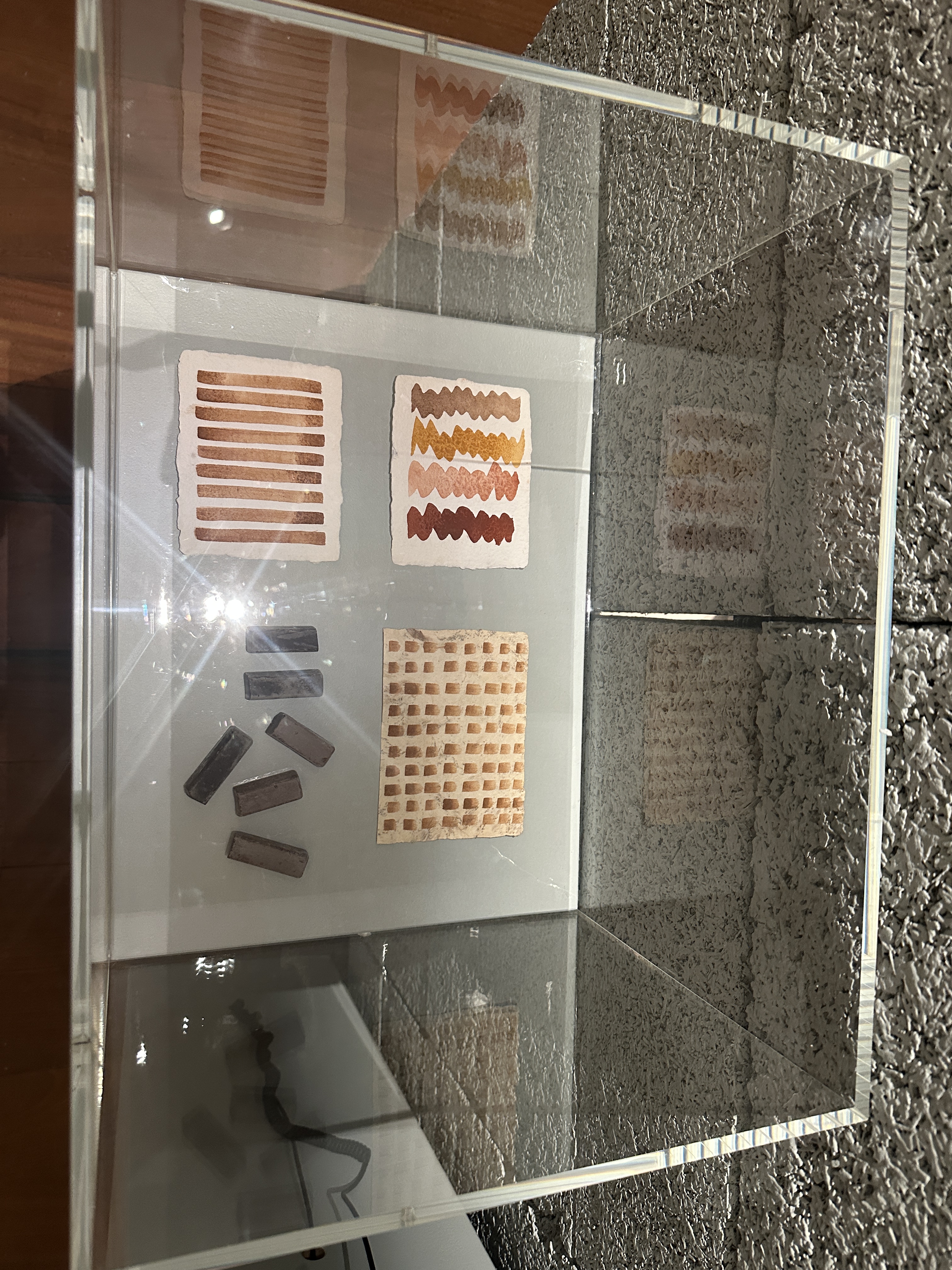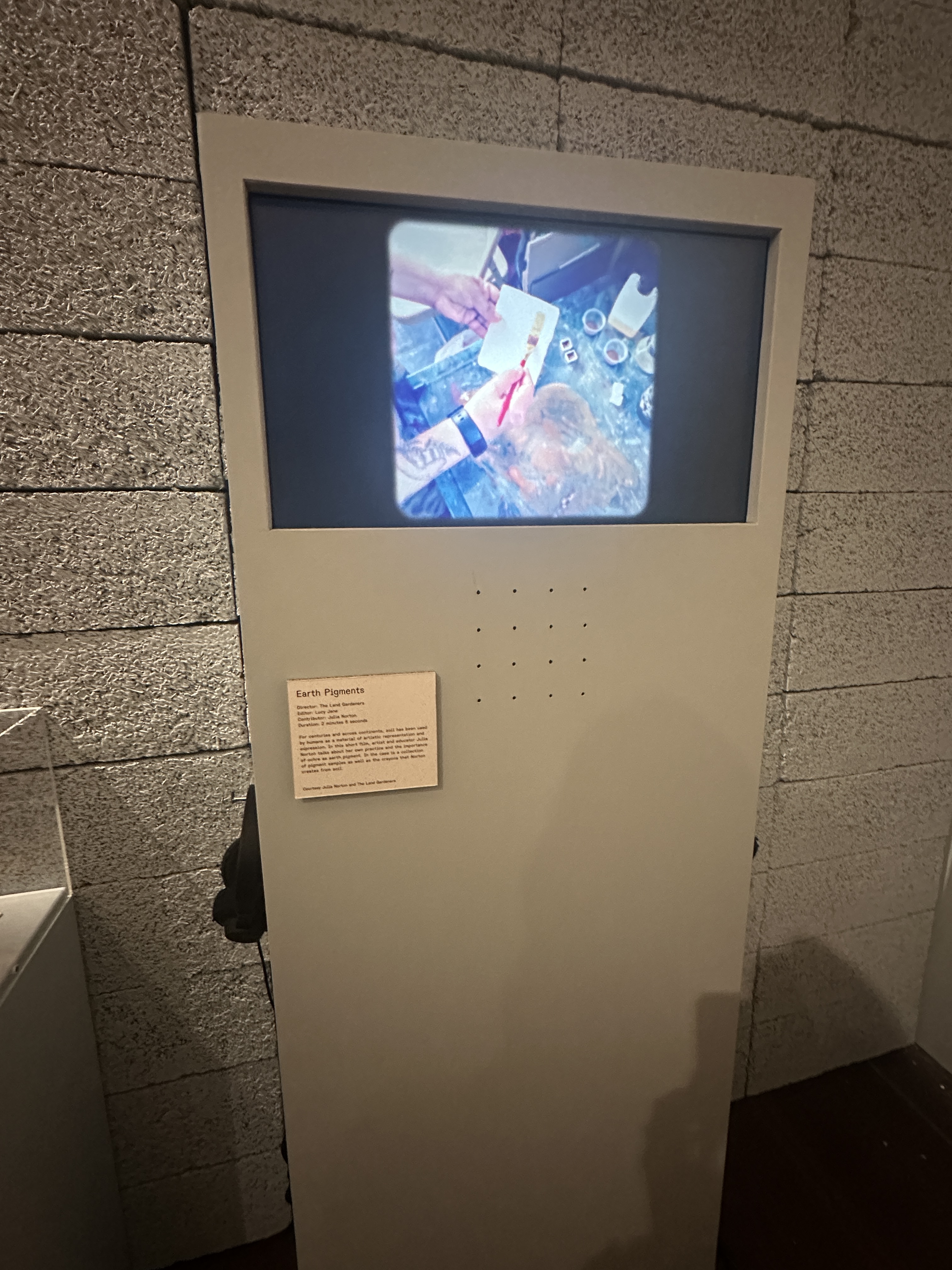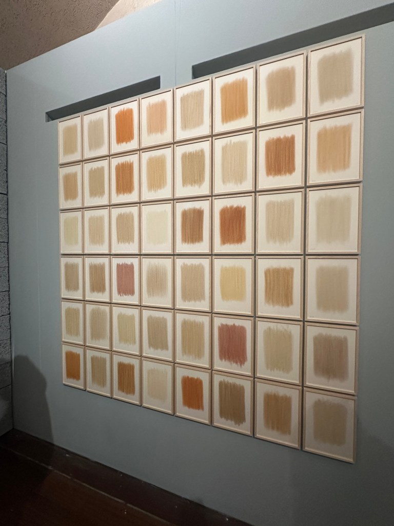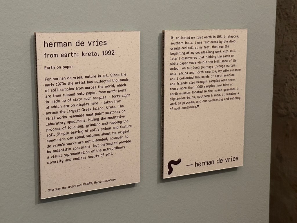 Most interesting for me, were some of the works on display which use the soil itself to create their art. Henrietta and Bridget had a short film on display at the exhibit, showing how they take samples of the earth and then paint them onto paper to demonstrate the wide gamut of pigments that can be found in the earth and its potential as an artists medium. Similarly, Herman De Vries who has since the 1970’s collected thousands of samples from around the world, for similar reasons but to bring awareness to us all about the vast beauty of that which is beneath our feet. The array of colours below are from samples taken on Crete.