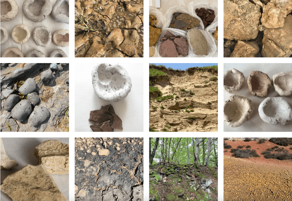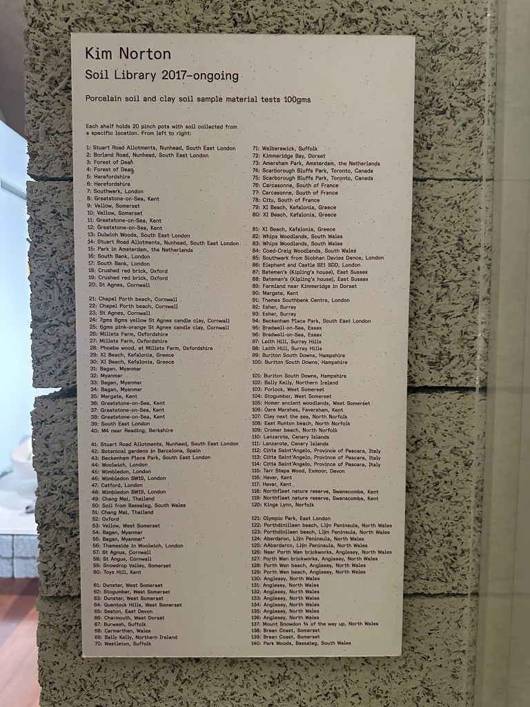 Kim Nortons ‘Soil library archive’ has been ongoing since 2017. So far she has collected over 160 samples from places in the UK, Europe North America and Asia. She only ever takes small amounts so as to minimise impact. She mixes these into porcelain and / or clay to make small pots which is what we saw on display at the exhibition.