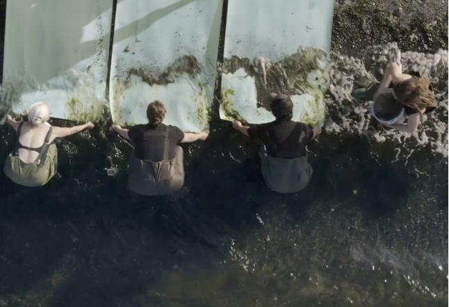 I’ve screen shot the above to show her work process, you can see in the top image how her team hold the sheets of coated paper and allow waves to wash over, collecting the sand and other minerals as they ebb and flow.