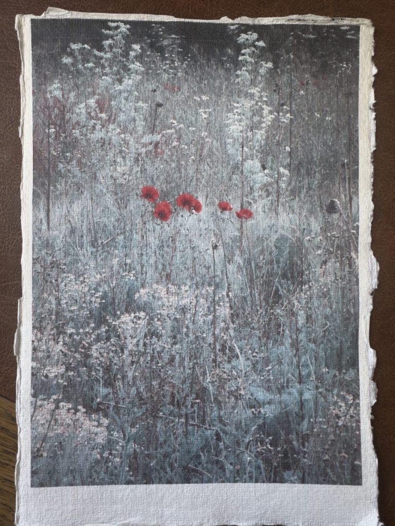 Taking on board the methods and motivations of the photographers, I tried printing on Khadi paper (see both images below) which is very rough and hand made. I recently photographed some wild flower fields on local farm land and I liked the bright red poppies in amongst the green and yellow. I printed to see how this might come out.. the colours are very muted but I suspect that is down to my skills and understanding of photoshop and printer set up! I will need to try and find an ICC profile to download to improve results, for a paper which is similar. Even then, having looked into this, an inkjet printer will always struggle to render the colours particularly well with papers such as this. It will be better to test on laserjet once I have access to one.