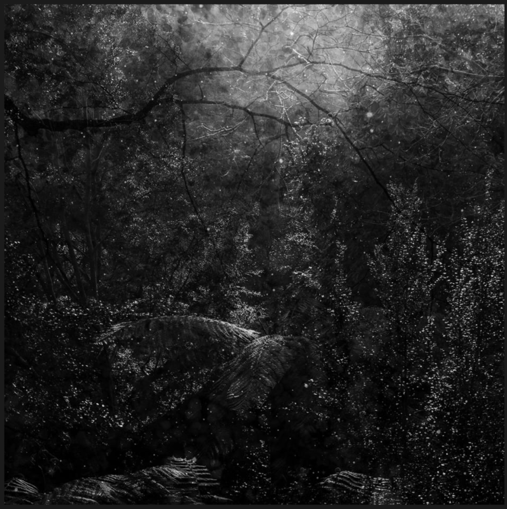 In the photograph below, it almost looks as though you could walk in to it and never meet the end. The luminous aspects of the image reveal its rich tones. I can see shadows and traces of leaves and branches, as well as the more easily definable elements, which gives a surreal effect. The astral quality by including a photograph of a very clear night sky (these appear a lot in his photographs) adds an ethereal element. These qualities combined mean the resulting image has a sense of the conscious and unconscious, with themes of memory, impermanence and impending change.