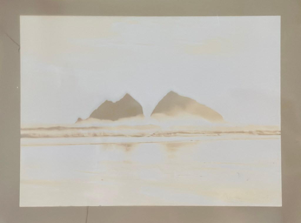 This was my first attempt, exposed with a digital negative in bright sunshine for 5 hours. A longer exposure time may have produced a higher contrast result. As it is it reminds me of an imported photo onto a computer screen that hasn’t fully loaded! The print is temporarily stored in a light tight bag until I complete further prints and then I will fix and wash in one session at home.
