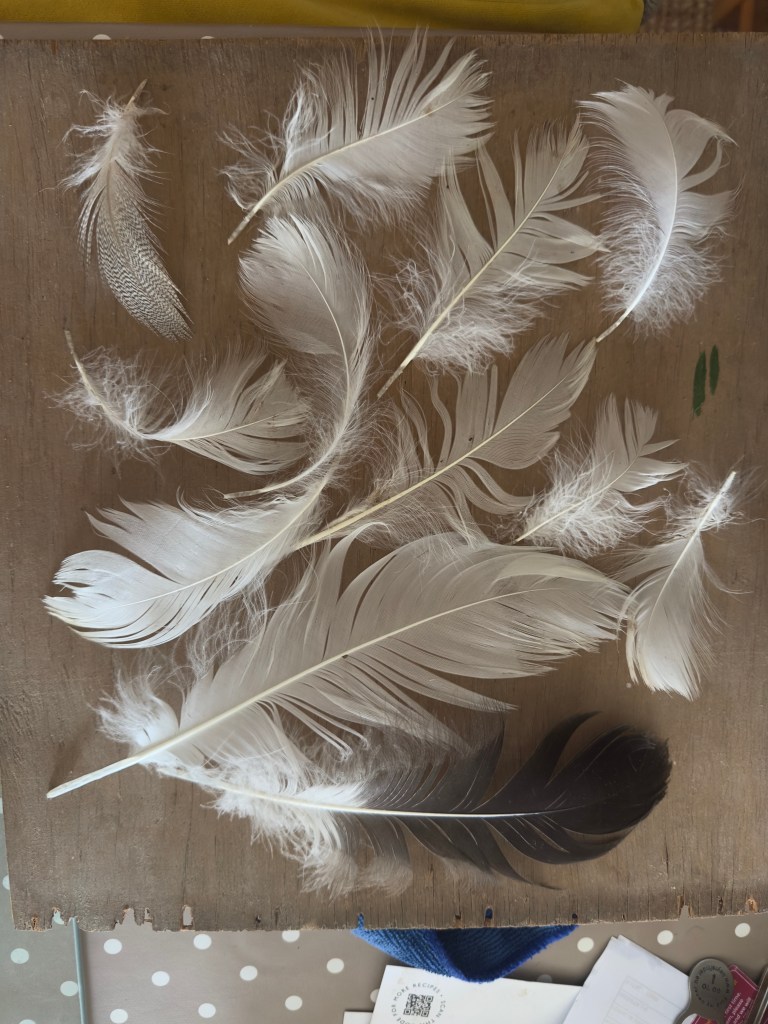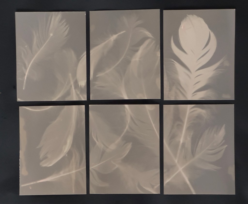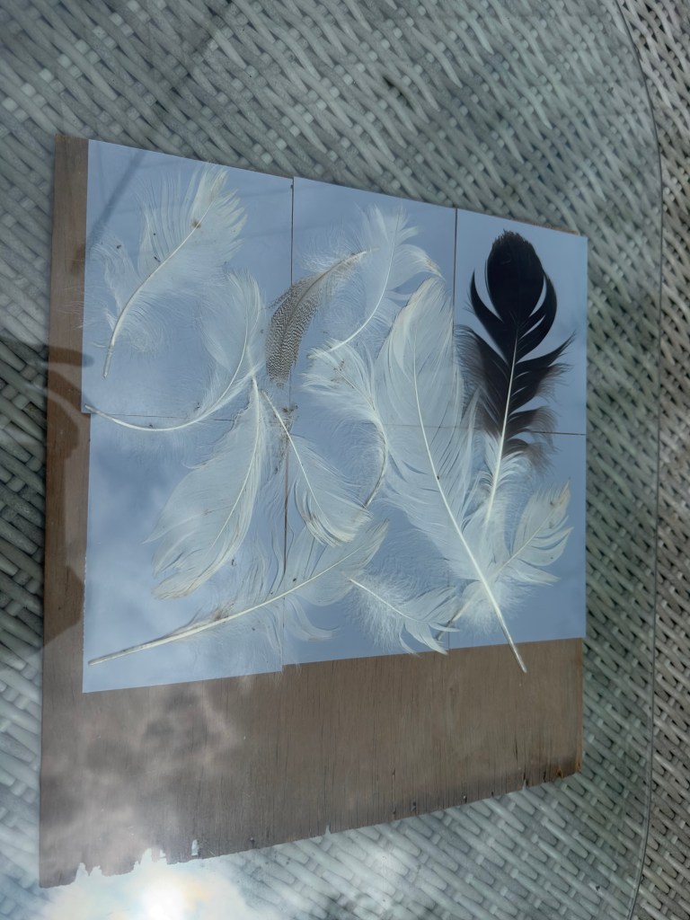 Jerry Burchfield is well known in this discipline and his book, Understory is a fascinating study of plant life and landscapes in Florida. The piece of work below was a commission, to produce a mural which represented the pine flatwoods ecosystem, for which he researched the local vegetation and flora in detail. Although he typically produces contact prints this mural was the exception, as he used a digital negative. The finished piece ended up measuring around 76cm x 25cm. As I am already looking at the idea of a mural type piece, following my introduction to the work of practitioners like Mike and Doug Starn and Marco Rappacini, for my professional example for this module, I will try and use all 6 pieces of my fogged ilford paper to display a handful of feathers that I collected from the bank of the lank at my mother and stepfathers. Although it won’t be a large piece, the principal remains the same. I wonder though if the feathers are too translucent, but it will be interesting to try. As I type, they are outside in the sunshine. I didn’t put them out until later in the day so I will leave until sun set at around 9pm.