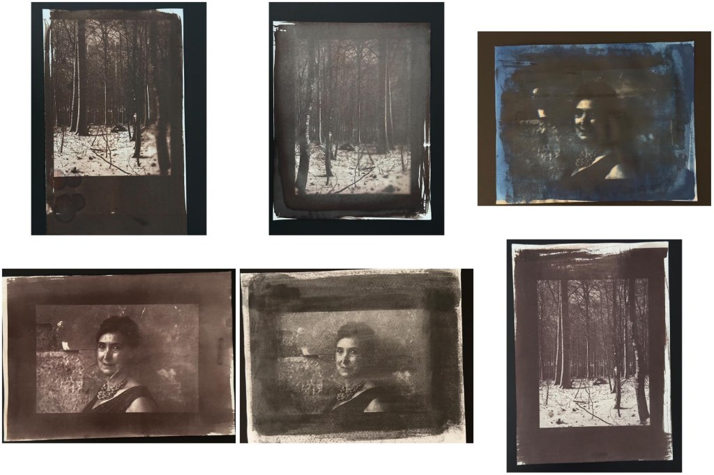Several that I tried which aren’t here as I disposed of them, were failures due to the paper I’d chosen. I found that the gum bichromate came off easily in the wash and so left no image. I also noticed that several here have what appear to be blurred areas but I realised that this was because I’d forgotten to put the weight on the UV lid. Out of all the experiments, I found salt printing and Van Dyke (top left) to be the most successful. I like the richness of the Van Dyke process, the salt printing was similar to cyanotype in that it seemed to be quite forgiving, I think it also gave higher contrast (bottom right)