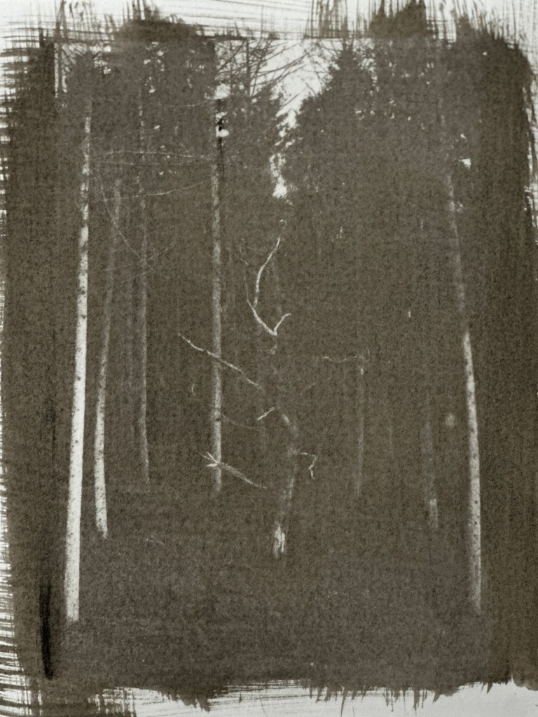 I applied the mix to the Hanhemuhle platinum rag (for the best consistency and to withstand the wash) and after application with the wet brush I used a large dry brush to try and blend the strokes. I don’t think I had the best brushes for this but nonetheless I like the added texture of brushstrokes. Once dry, I placed the paper and negative inside a picture frame and was careful to make sure there were no gaps underneath, to avoid any blurred sections.
