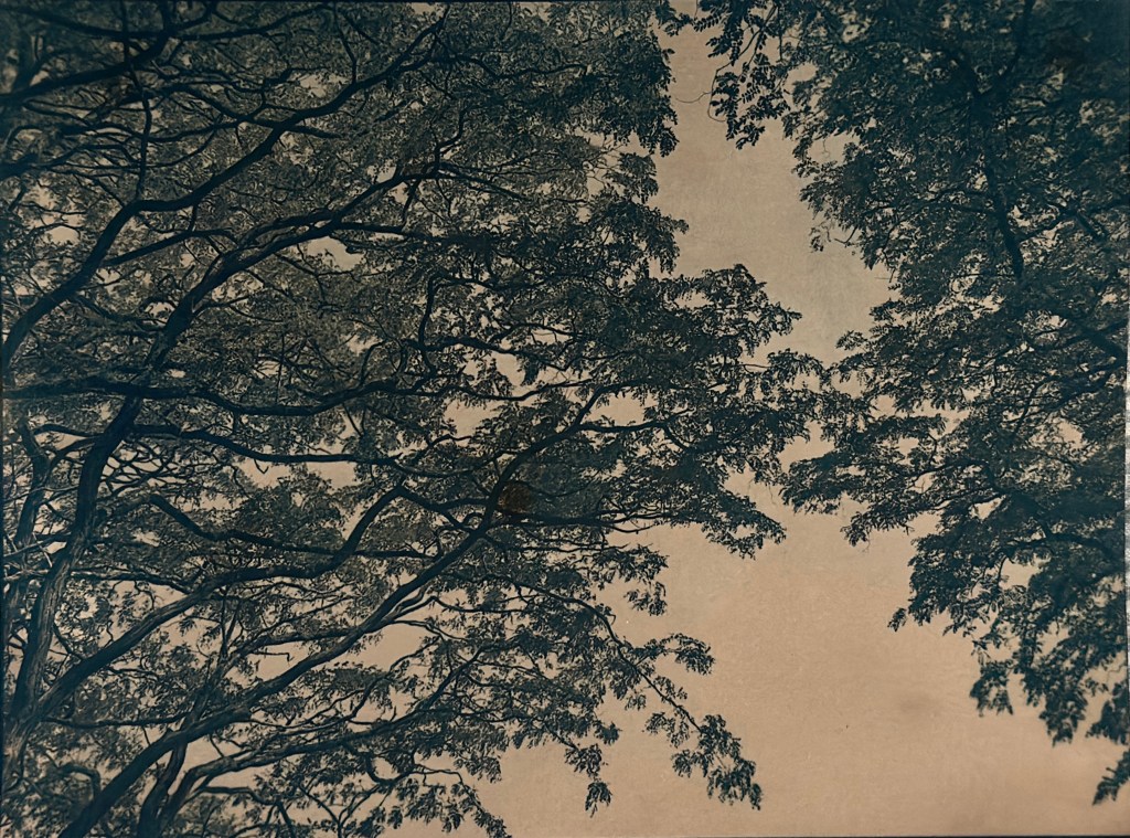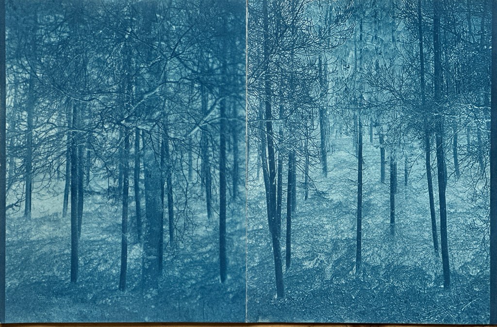 For the second image down, I made a diptych, slicing the image in half and then exposed on two sheets of 10×8 rag paper, as before. I also soaked this in coffee grounds, it is a much deeper blue (as a result of a different exposure) and is darker overall. I like the tones here and darker shadows.
