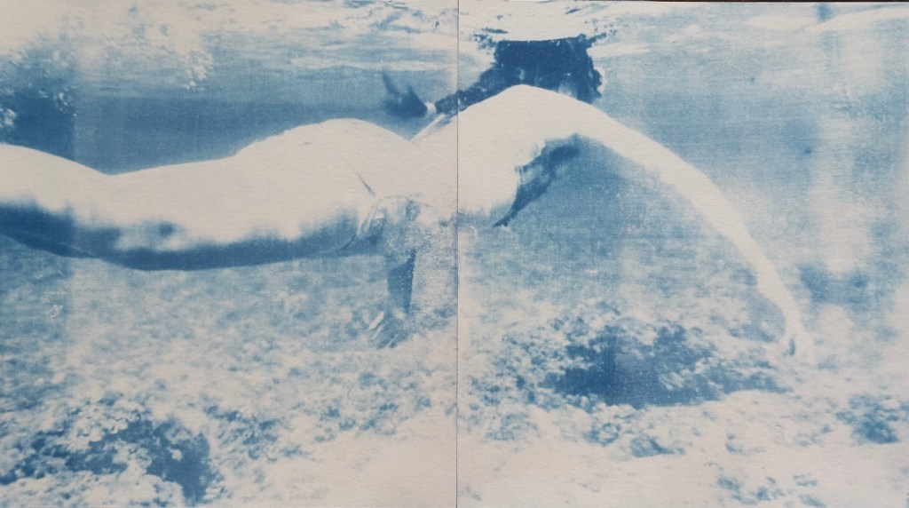 - In the diptych print (bottom) I took a screenshot from an underwater video that I took last summer when in Menorca. I like the effect of the water in cyanotypes, although the print itself needs more refinement I think this does demonstrate its versatility.