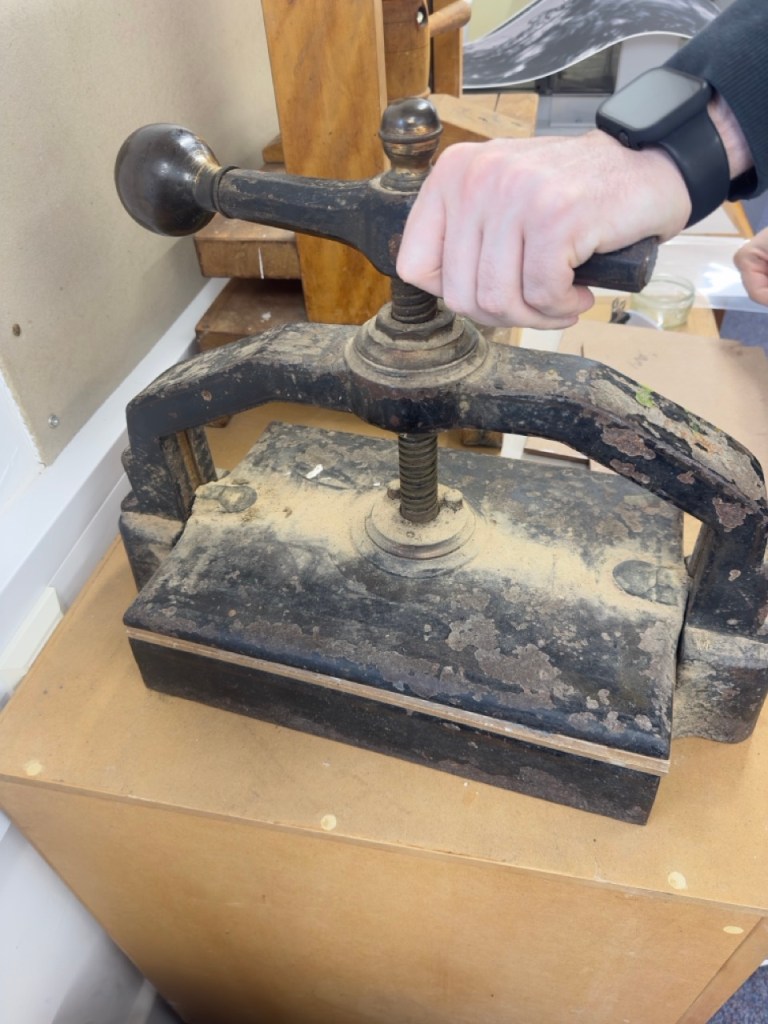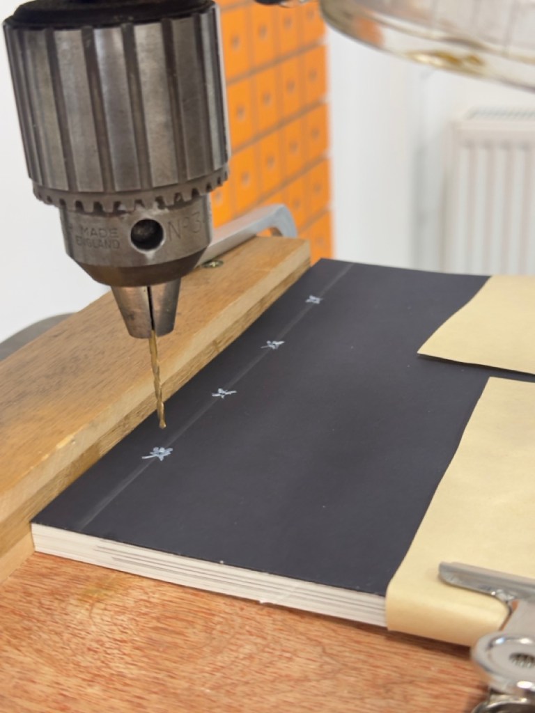 To finish the book, the technican pressed two pages of parchment together to create a thicker back and then once I’d cut it in the guillotine, I carefully lined all the pages up before marking out the holes on a template. I drilled the holes as it was too thick to use an awl: