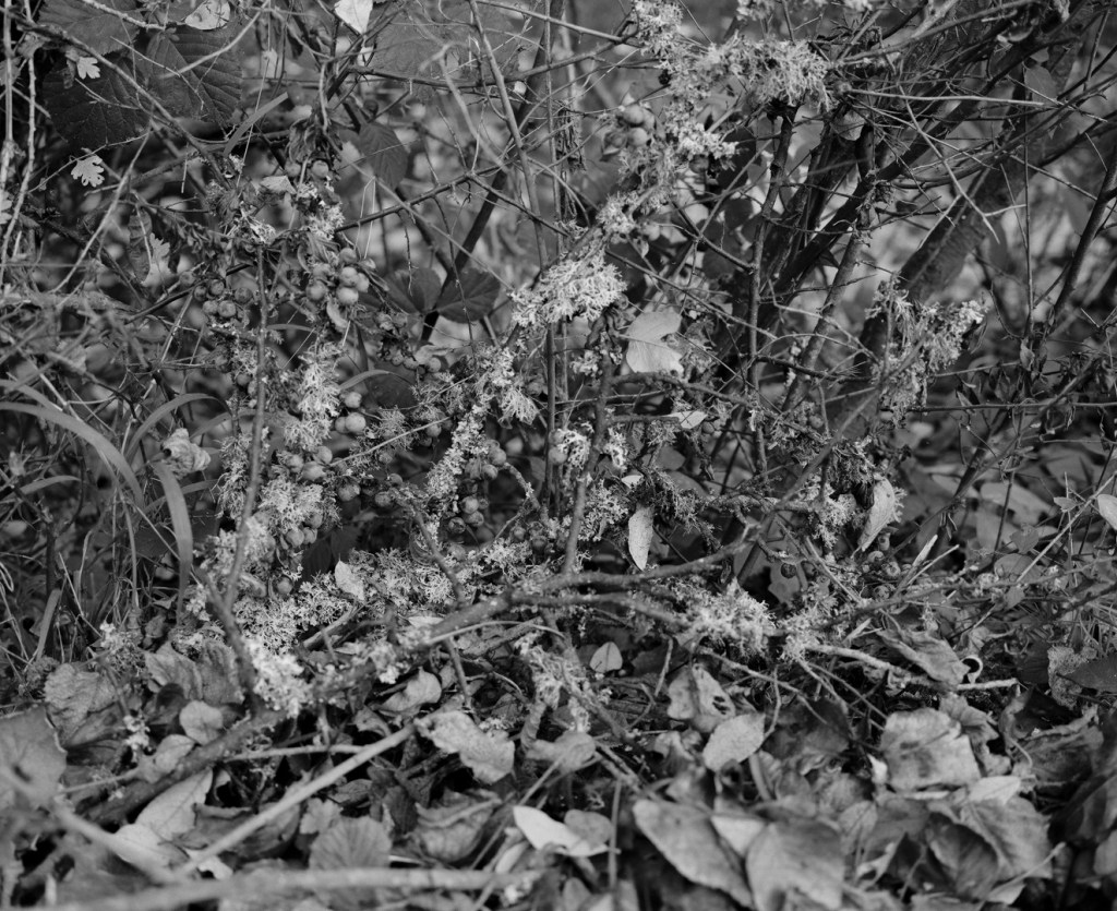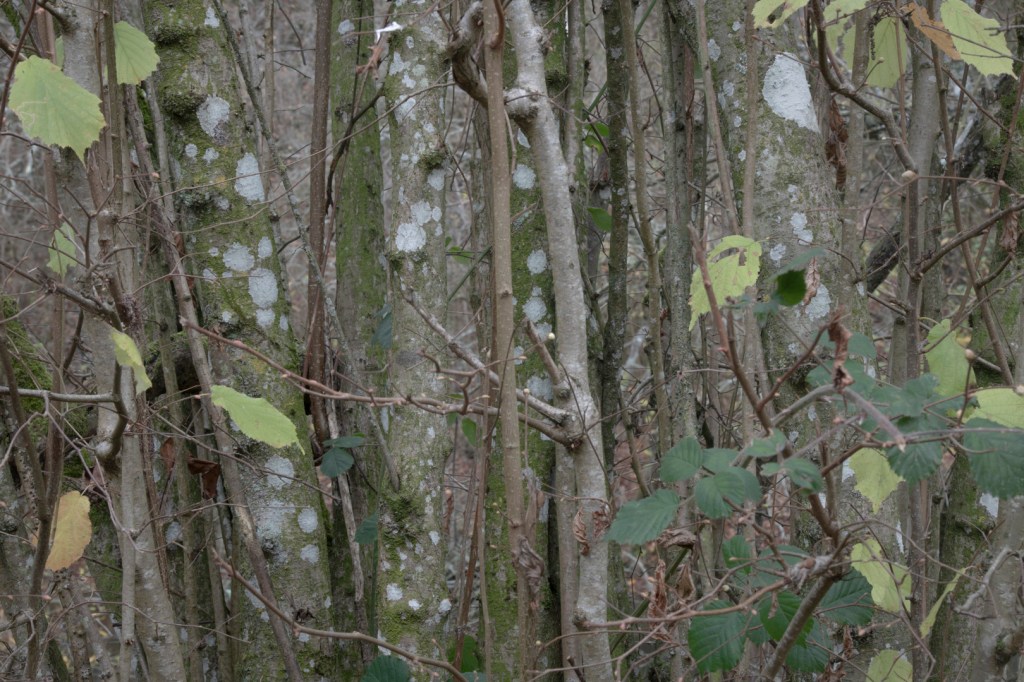 The close shots of moss, berries and lichen indicate the time of year and are intended to be a closer study of the environment and can be a way for knowledgable viewers to read the place, understanding what thrives and where, what sort of woodland this is, how old it might be etc. The woodland trust has a useful guide for ‘indicator species’ of lichen, for this purpose: https://www.woodlandtrust.org.uk/blog/2019/04/what-is-lichen-seven-types-of-lichen-found-on-trees/