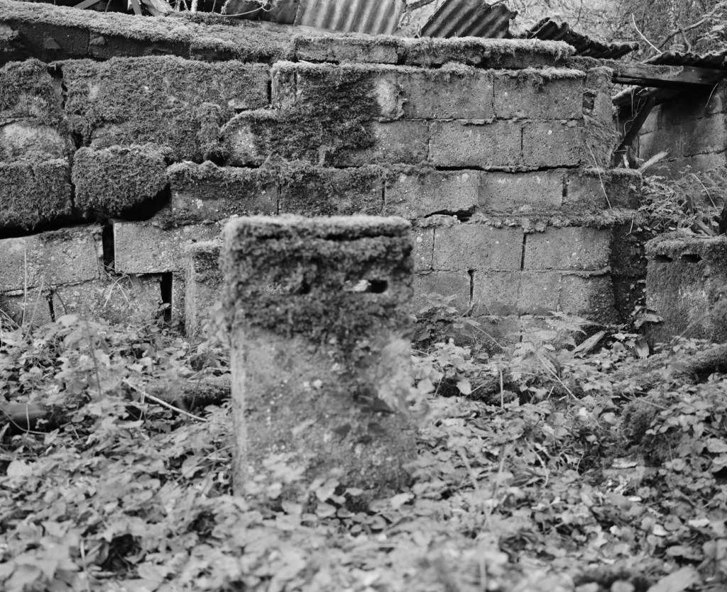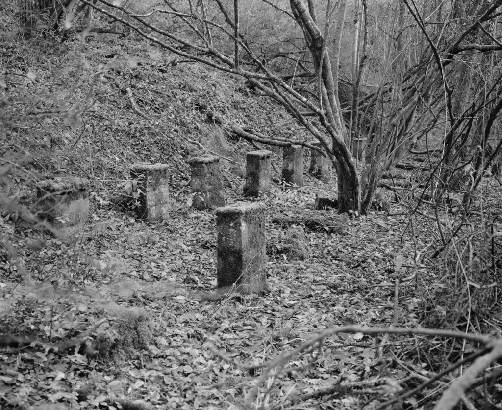 This area of the wood is very quiet. There is an old collapsing building with the remnants of agricultural machinery gradually being consumed by the landscape. There are some eerie looking foundation stones from what I assume would have been an old agricultural barn, although I can’t find any reference to it to confirm. They really resemble gravestones in the way they all face the same way and lean as the ground gives way to them. Given their position, I wonder how long the trees have been there and which came first. I remember coming here many times as a child and I remember it being almost exactly as it is now.