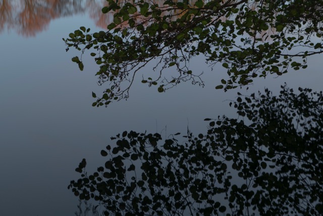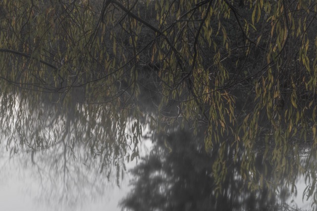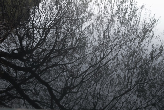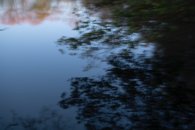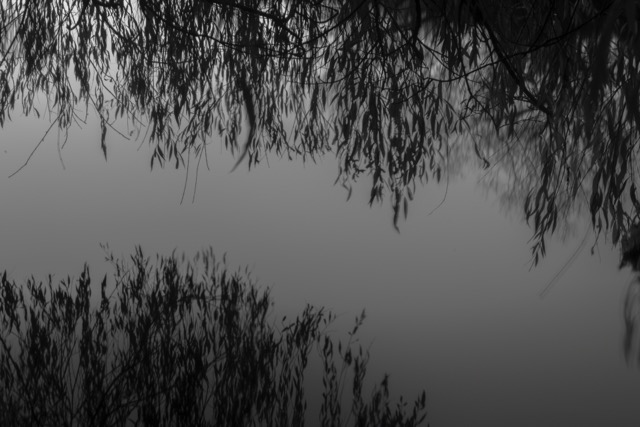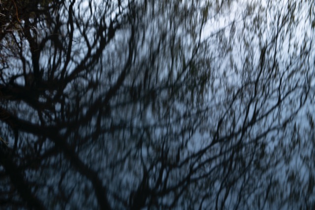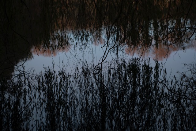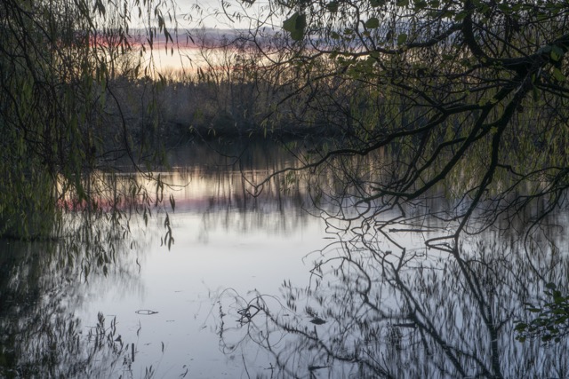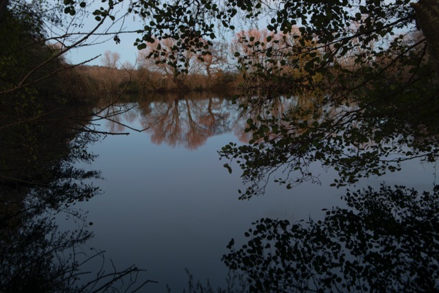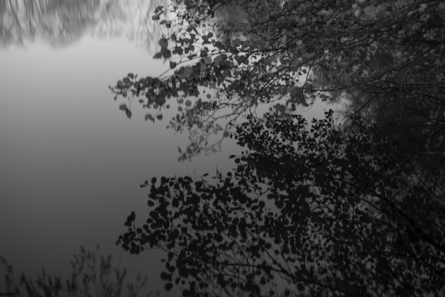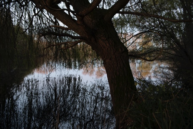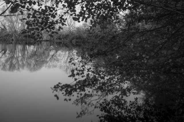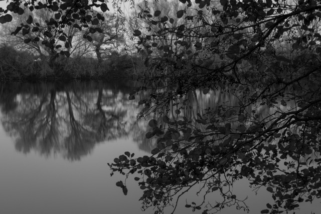 My most successful photograph is the one shown below. I felt as though I was part of the landscape at this point, I was surrounded by it as I nestled in to the bank of the pond and just sat there a while. The corvids above were raucous but befitting. The moment was only broken by the sound of a small plane going over me above. I like that there is so much going on in this photograph, the scene is framed by the trees and the fallen branch in the water in the distance helps to anchor the image. The reflections in the water create some ambiguity which I always favour.