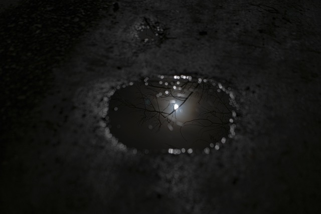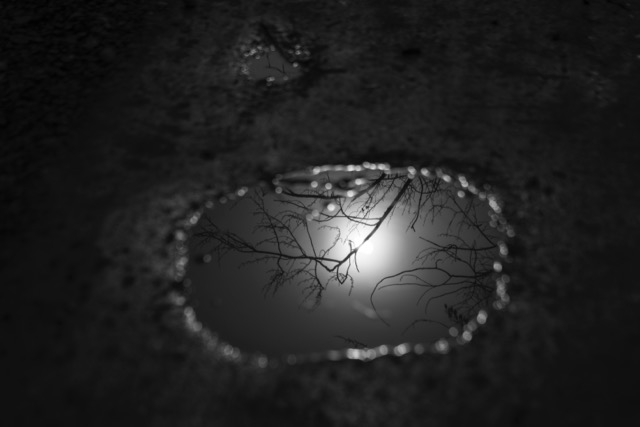 As I was about to leave, I turned around and saw the perfect reflection of the moon in a puddle. I got the camera back out and photographed it, also the scene of the driveway down to the area of the property where the rented sheds are.