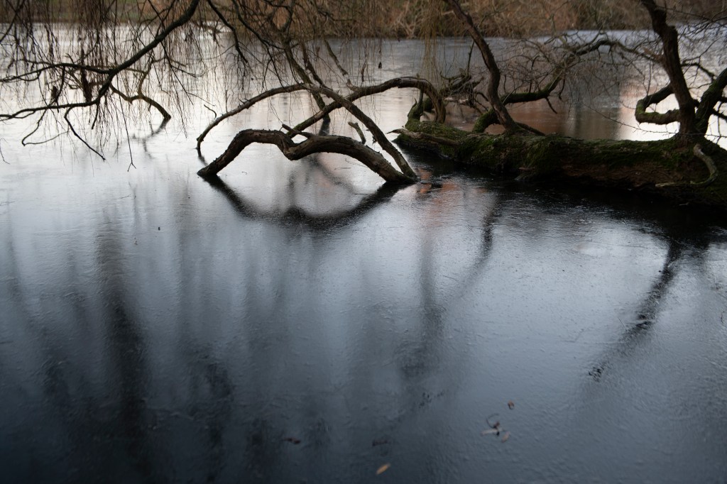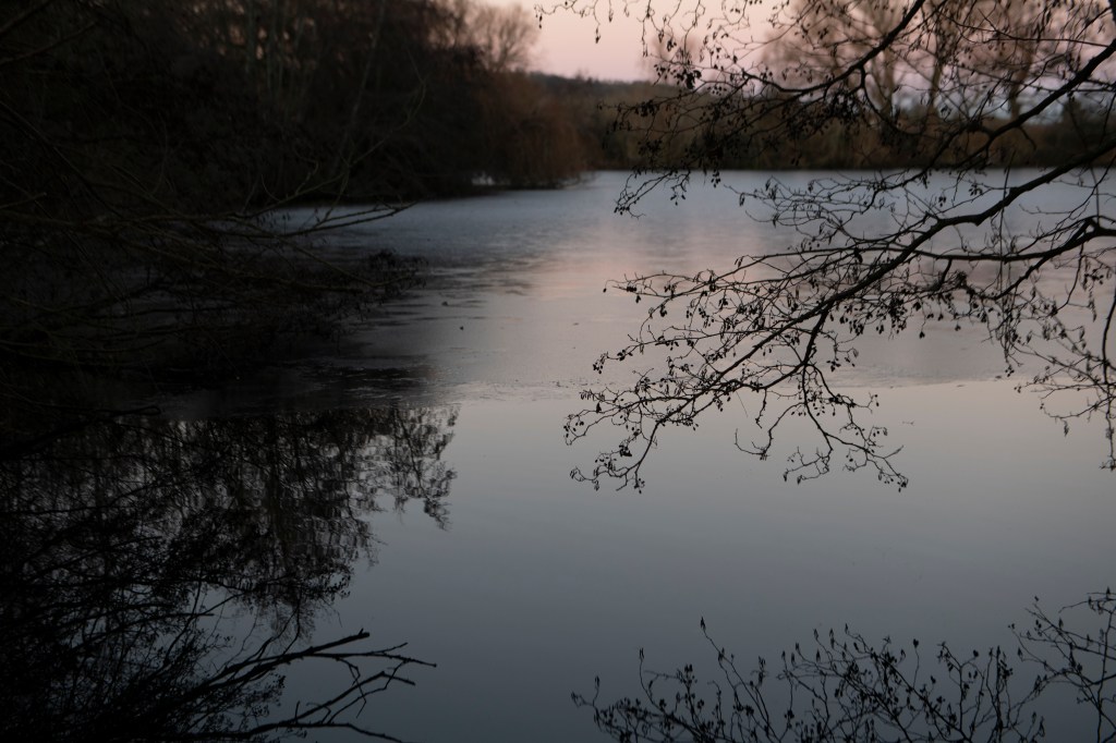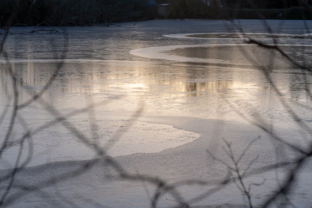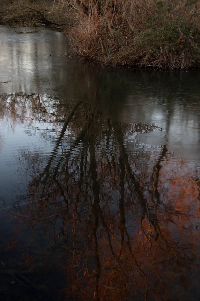 This is the analogue shoot I did alongside the digital one on the same day. I used Ilford 400 film, which has been reliable and forgiving in a broad range of conditions. I had loaded the film before heading to the lake, I wanted to photograph without having to think too much.. however, this did become tricky at times when I couldn’t feel my hands! I moved slowly around the lake, listening and feeling the environment. I studied the places I have walked many times before but noted how they were almost unrecognisable in this new, icy world. An entiurely different atmosphere exists, it was both eerie and intriguing. My curiosity meant I stayed much longer than planned, fascinated by the images frozen on the lake surface. I literally couldn’t stop watching. Nothing moved. It was silent and as the sun went down, a pink, orange, winter sky cast its image across the ice. It was so beautiful. I wrote a short poem in response: