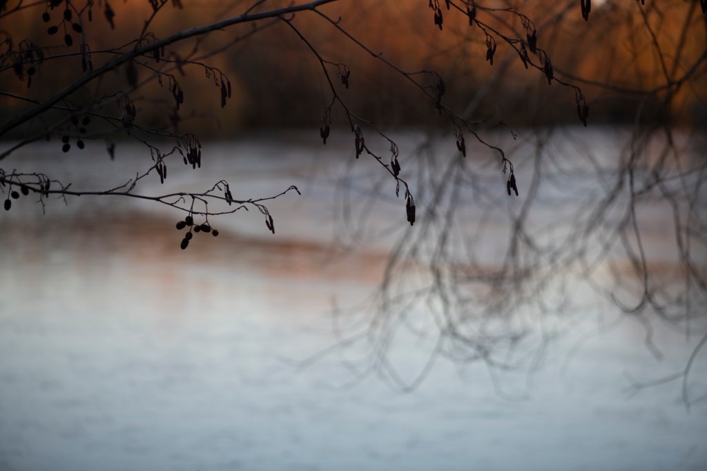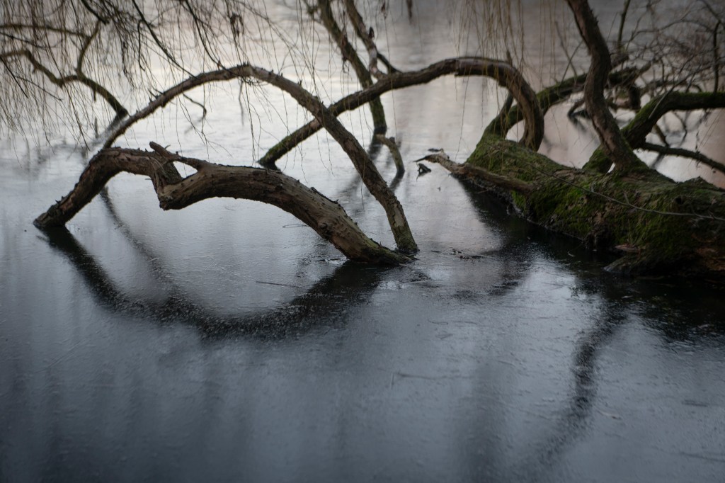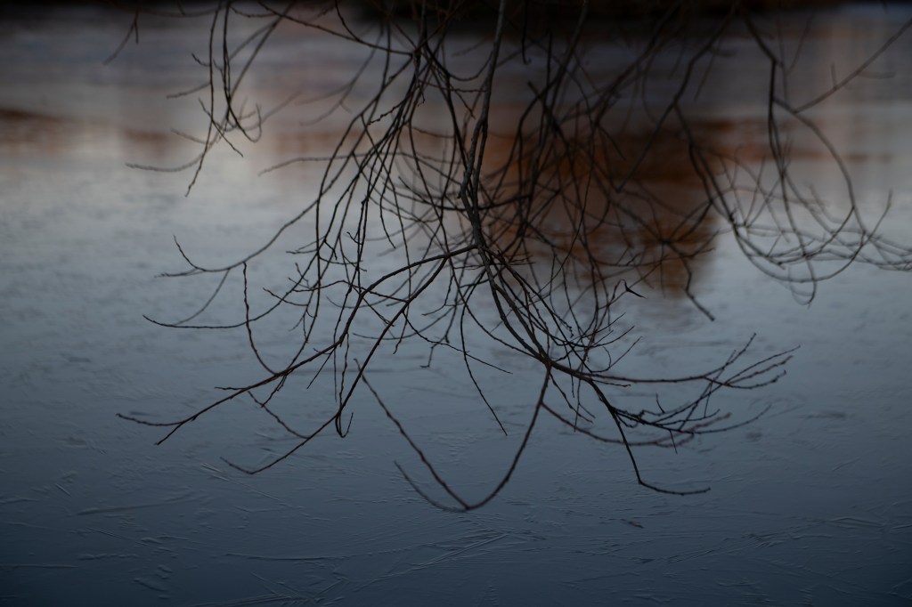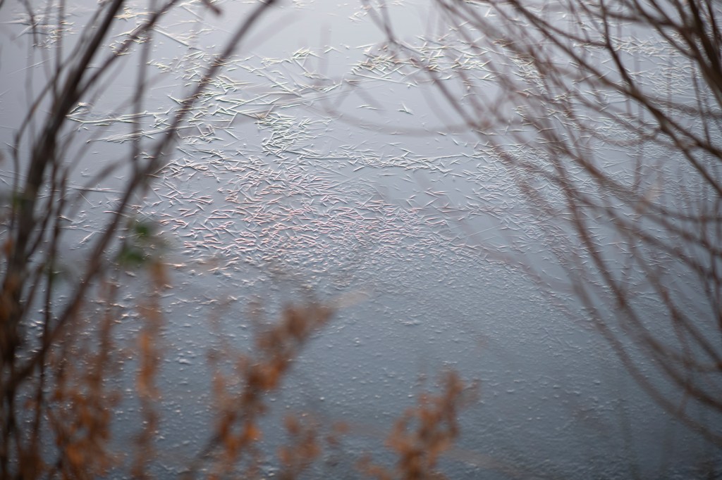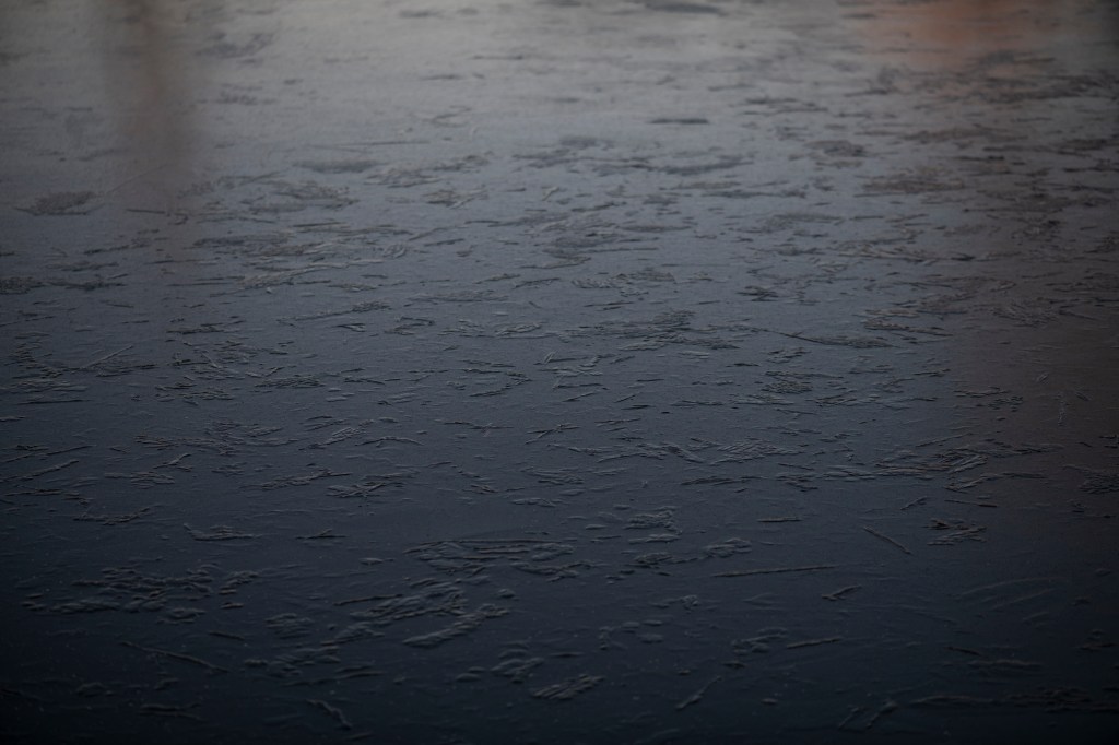 This is the analogue shoot I did alongside the digital one on the same day. I used Ilford 400 film, which has been reliable and forgiving in a broad range of conditions. I had loaded the film before heading to the lake, I wanted to photograph without having to think too much.. however, this did become tricky at times when I couldn’t feel my hands! I moved slowly around the lake, listening and feeling the environment. I studied the places I have walked many times before but noted how they were almost unrecognisable in this new, icy world. An entiurely different atmosphere exists, it was both eerie and intriguing. My curiosity meant I stayed much longer than planned, fascinated by the images frozen on the lake surface. I literally couldn’t stop watching. Nothing moved. It was silent and as the sun went down, a pink, orange, winter sky cast its image across the ice. It was so beautiful. I wrote a short poem in response: