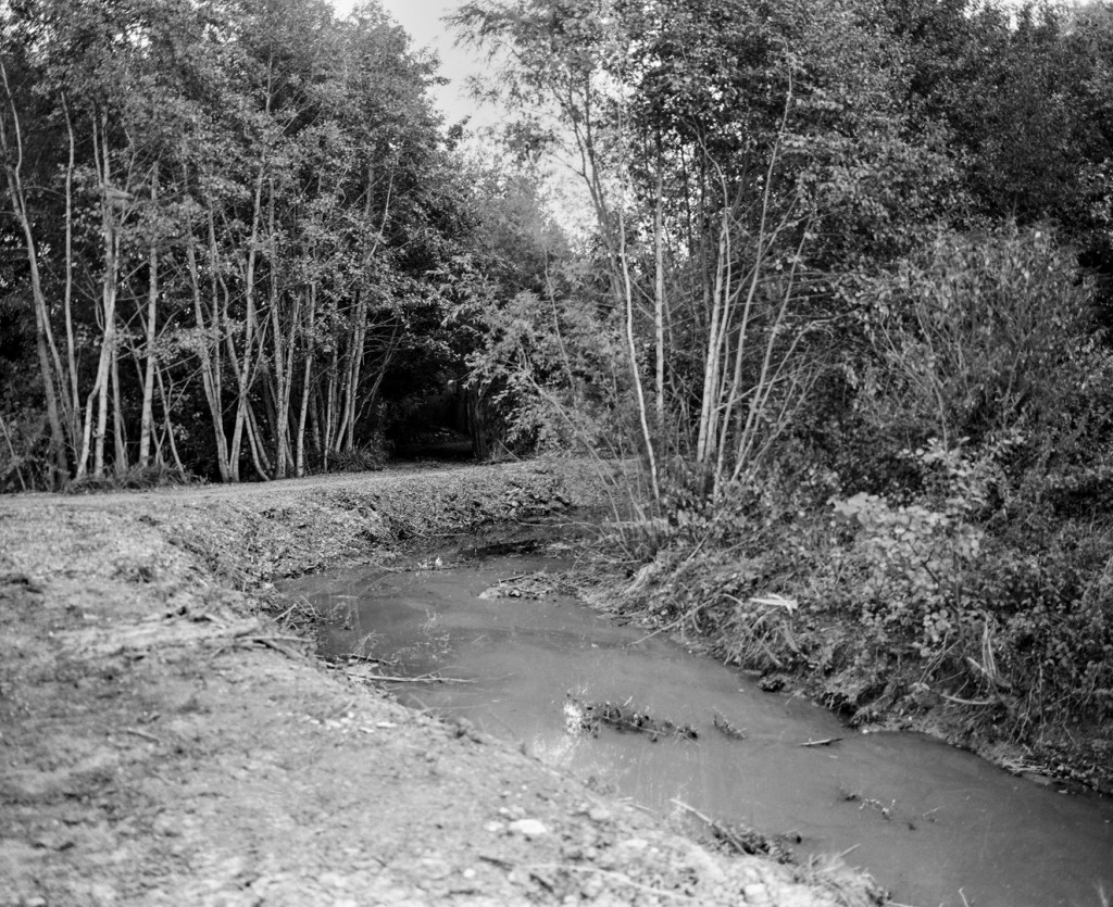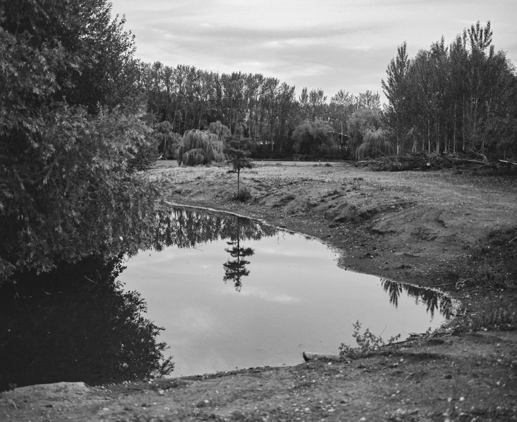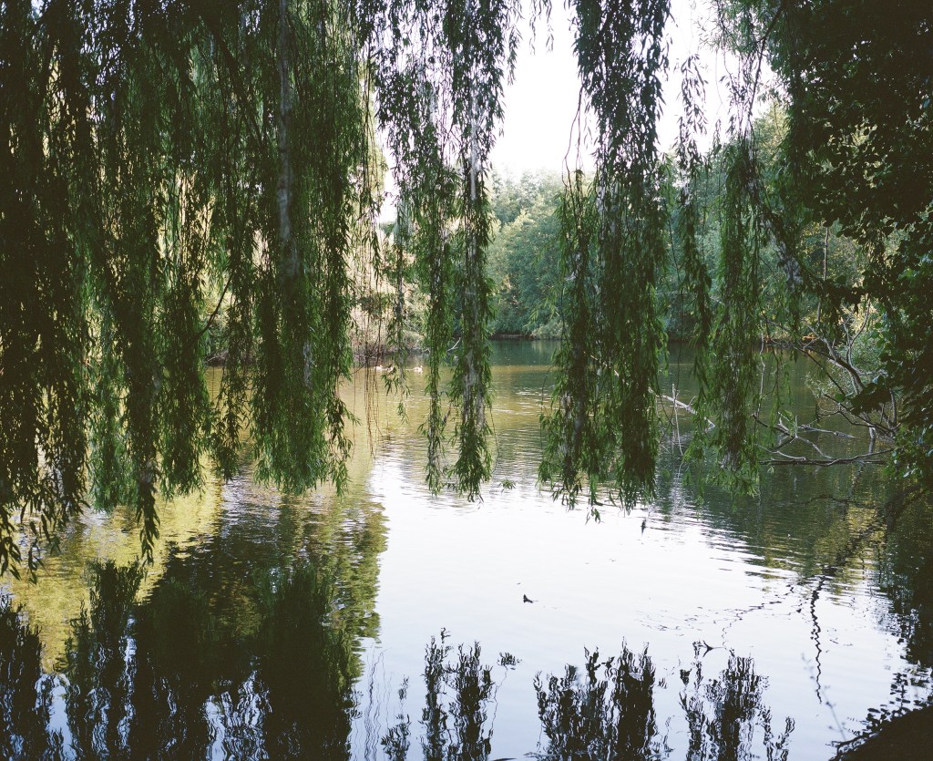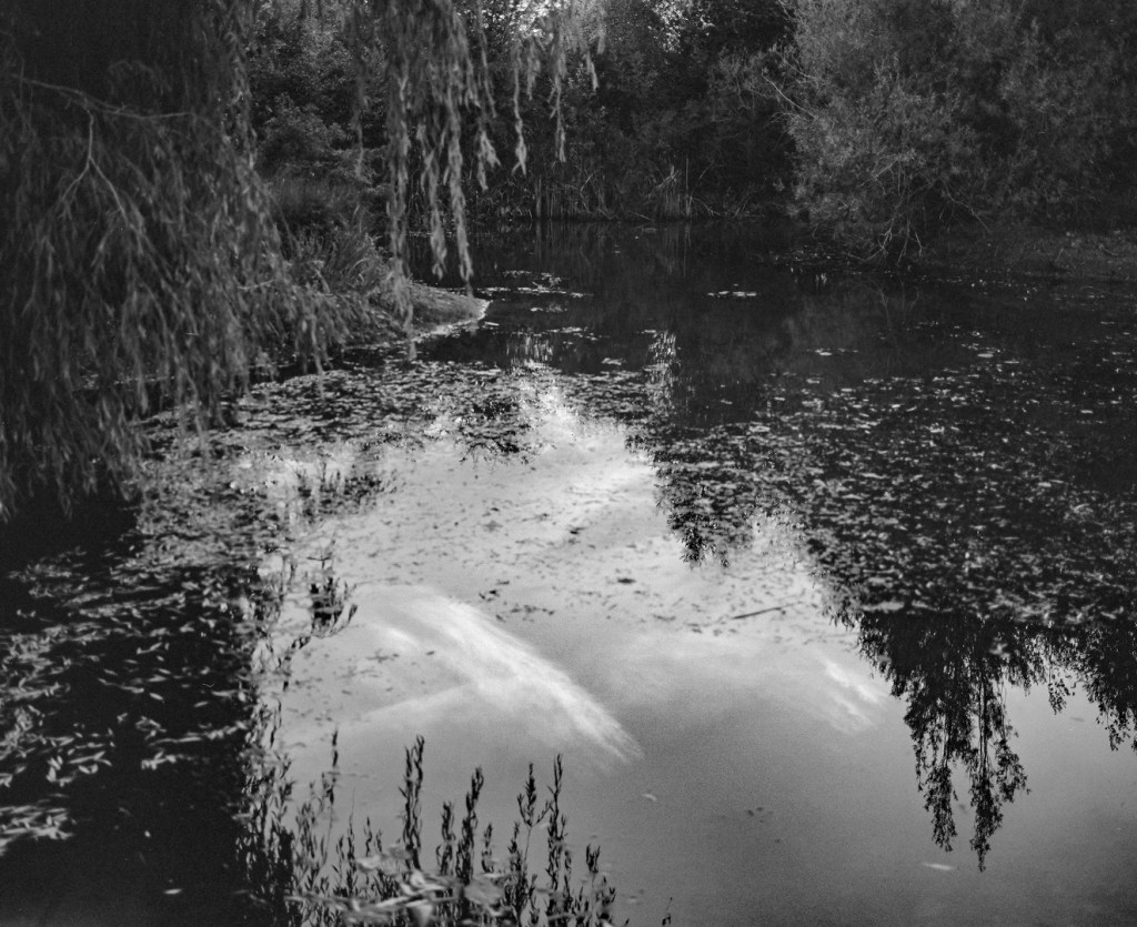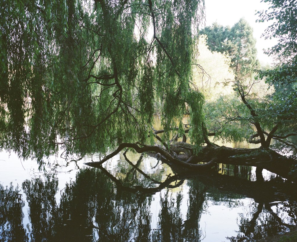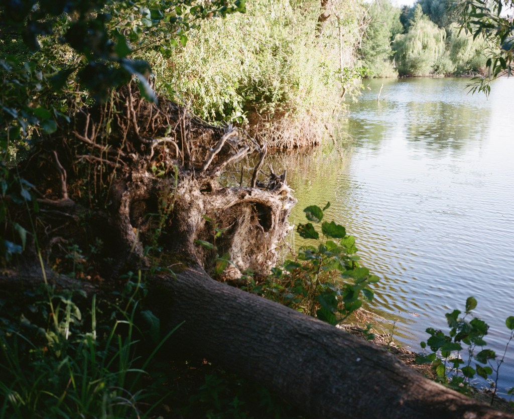 The next set of images is from the adjacent lake, this is less used as a ‘playground’ as it is close to holiday yurts that my mother and stepfather rent out. Also manmade, these have over the years changed shape as my stepfather digs out channels and creates small island areas for the wildlife. Not one to leave things be, he enjoys creating spaces for all (people, plants and animals alike) which results in an abundant landscape. For these images, I was able to concentrate on smaller details, like the reflections of the trees, plants and the exposed roots. This was taken at a time when Southern areas of the UK had no rain for 45 consecutive days. The impact of this was so clear to me when I took these photos. Areas of the lake were completely dried up and you could walk from one section to another, without getting wet! Even the algae bloom was everywhere this year which you can clearly see on the lake surface. I like the traces of the ducks etc in the water, revealing where they’ve been, which of course would be impossible without the algae.